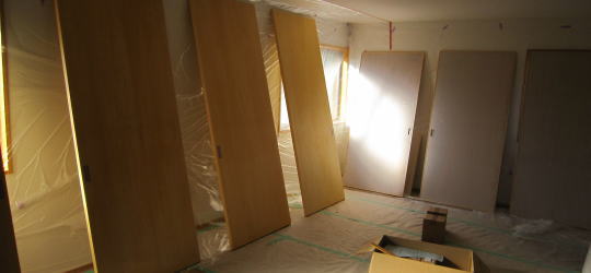 家の中に入ると、昨日塗られた建具が綺麗に並べられ、養生している最中でした。