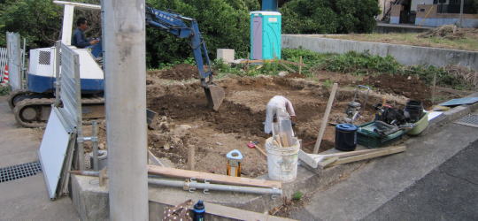 建築 2010.8.28 根伐り工事の様子 大黒柱の家は、根伐り工事中。 タイガーパイルで地盤補強しているので、杭の柱頭を壊さないように、掘削作業は慎重に行われてます。結構な数の杭が打たれているので、掘削作業も大変です。 朝夕は涼しい日もあるこの頃ですが、日中はまだまだ暑い日が続きます。 そんな炎天下の中、気を使う作業にはイライラしするかもしれませんが、慎重に、慎重に。 来週には基礎の耐圧盤の配筋検査。 皆さん、ご苦労様です。