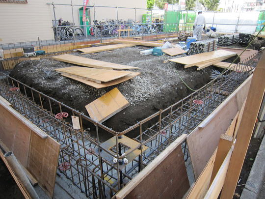 建築 2014.8.12 基礎配筋中 平塚駅前で、平屋の貸店舗を新築工事中。 現在、基礎の配筋中。 圧接するほどの太い鉄筋が無いのが救い。 圧接とは、太い鉄筋の先端を押し付け合い、高温のバーナーの熱で溶かして接合させる方法のこと。 当然ながら、熱いのです。 施工している人は勿論ですが、その周辺の人も熱いし、離れているだけでも熱い。 この時期、外で仕事をする人は大変です。