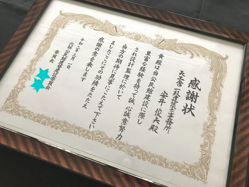 昨日の午後、小田原市穴部公民館の落成式が行われました。小田原市長・教育委員長とした偉い方が招かれ、公民館の落成がご報告されていました。私もお呼ばれし、感謝状を頂戴いたしました。立派な感謝状(額付)ですので、事務所の何処かに飾らせていただきます。この後、既存公民館の解体工事や公園への整備工事へと続きますが、まずは一区切りです。