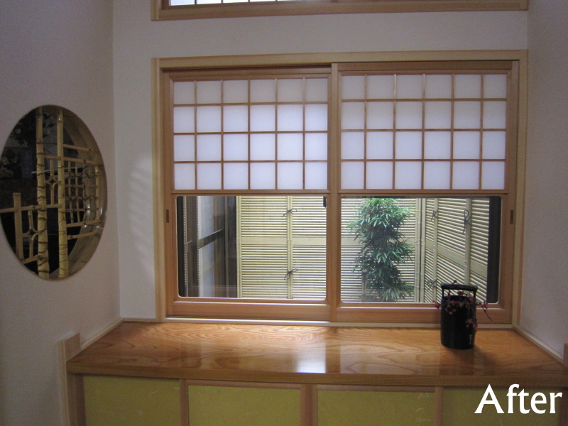 小田原七福神の一つ、毘沙門天を祀る由緒正しいお寺さん。その中にある檀家さんたちが集まって話をする場所を、明るく快適な場へと改修する計画。改修した部屋の面積は、8帖にも満たない小さな空間ですが、面積には表せない坪庭の改修や、そこにあることが相応しくない設備機器類の移設といった、小さな配慮がたくさん詰まっています。工事に派手さはありませんが、細かい配慮の行き届いた設えは、現場で作業された大工の腕と配慮の賜物。小さな気遣いの積み重ねが大きな仕事にも繋がるという、見本のような改修工事です。