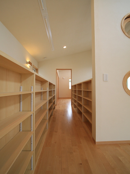 駅前に開発された住宅地の中に建つ家。1階の玄関脇に大きな収納スペースを設け、スキー板やバイクのヘルメットと言った趣味の品から、ベビーカーやストック用の食料品と言った日常品までもを収納する場所とした。玄関とキッチンからの出入りが可能な動線とし、小さなお子さんを育てながらの家事動線的に最大限に配慮している。